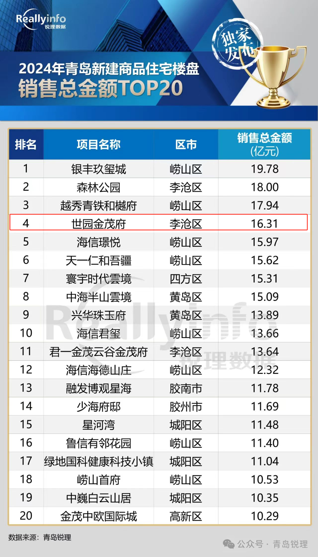 克日,,,,,,,,2024年轻岛市商品房销售榜单正式宣布,,,,,,,,青岛William希尔官网入口集团世园·金茂府项目以16.31亿元销售总金额荣登2024年轻岛新建商品住宅楼盘销售金额榜第4名,,,,,,,,逾额完玉成年销售目的使命。。。。。