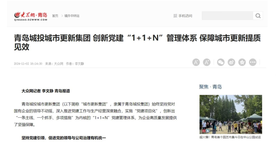 【公共网】青岛William希尔官网入口都会更新集团 立异党建“1+1+N”管理系统 包管都会更新提质收效